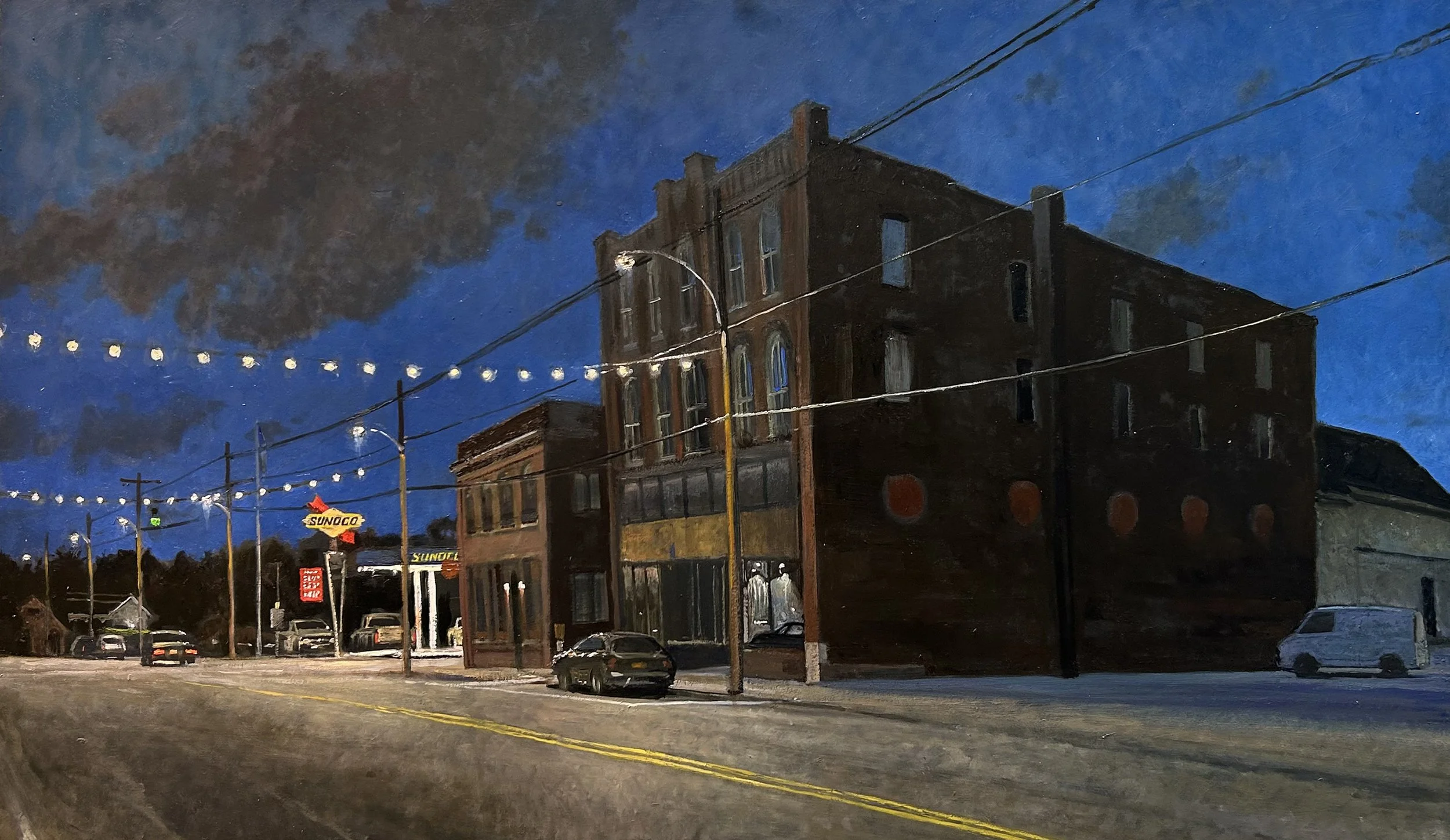 SOLD Eric Forstmann, Downtown America, 2025, oil on masonite, 16.25 x 28.5 in.