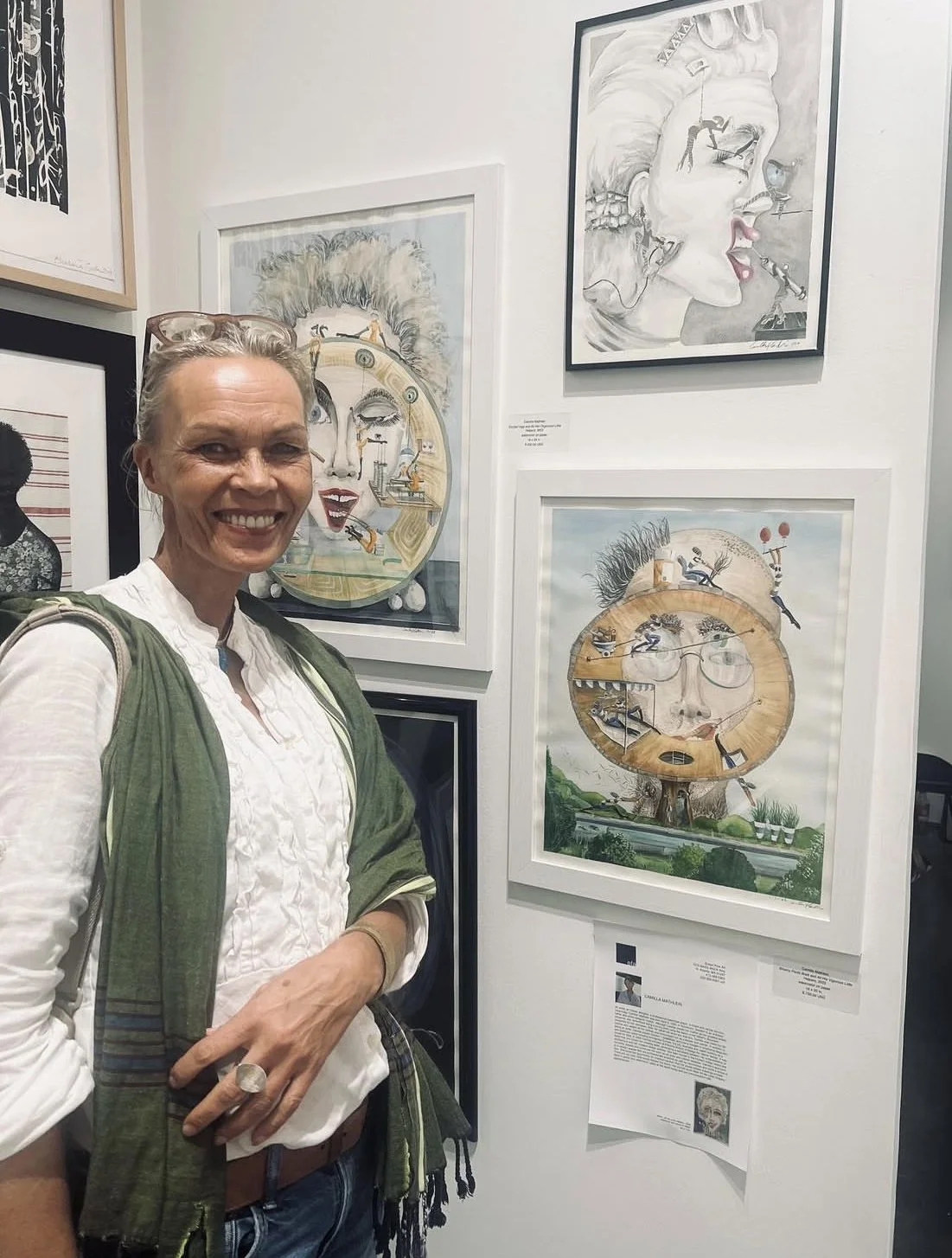 An artist, an interior designer, a professional basketball player, a model and cancer survivor, Heta Katja “Camilla” Mathlein was born April 9, 1963 in Stockholm, Sweden to an architect father and textile designer mother. Although Camilla credits her mother as her greatest artistic influence, she remembers being a young child using the backs of her father’s discarded blueprints for her canvases. After her father left when she was five, Camilla was raised by her mother who sewed all of her clothes and encouraged her as a drawer and painter. In addition to being an artist, Camilla played Division 1 basketball, survived a Hodgkin's lymphoma diagnosis and spent ten years traveling throughout Europe, the US, Australia and Japan working as a model for Elite. In 2000 Camilla enrolled at Parsons School Of Design for interior design. It was there that she honed her drawing skills, developing a symbiosis between her understanding of architecture and her creative design abilities. She later moved to the Hudson Valley where she currently resides and continues her work as an artist and interior designer. Camilla’s approach is to design spaces that are architecturally practical as well as harmonious and invite a sense of flow. She loves the opportunity for creative freedom that her purely artistic drawings provide. There are no rules. She simply follows her fancy. Her current work titled, “All My Little Helpers” done in pencil and watercolor, takes a look at the world today and our preoccupation with appearances.
